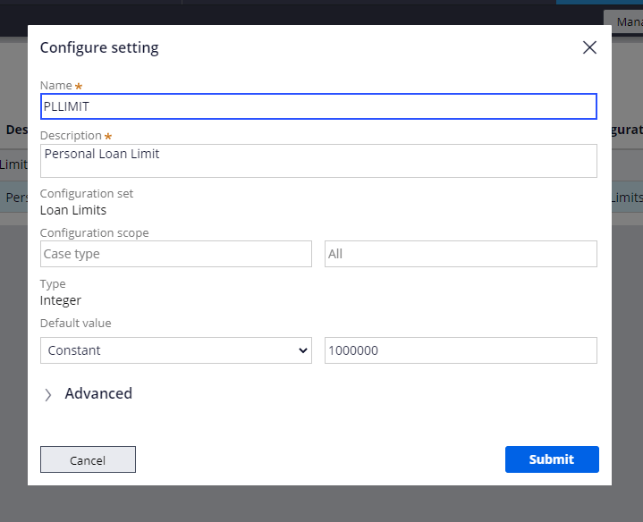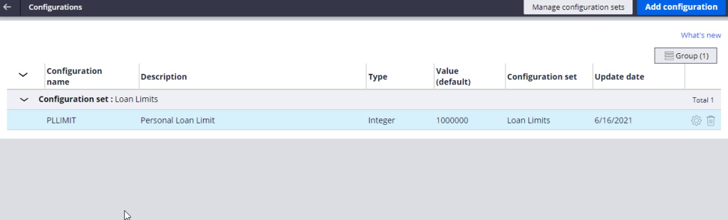 First of all, lets understand what is configurable sets? Its simple, its a variable/property. When you have a group of related data variables, its called as configurable set!! For example, loan limit, loan offer & other loan related attributes, can be called as a loan limits as shown below.